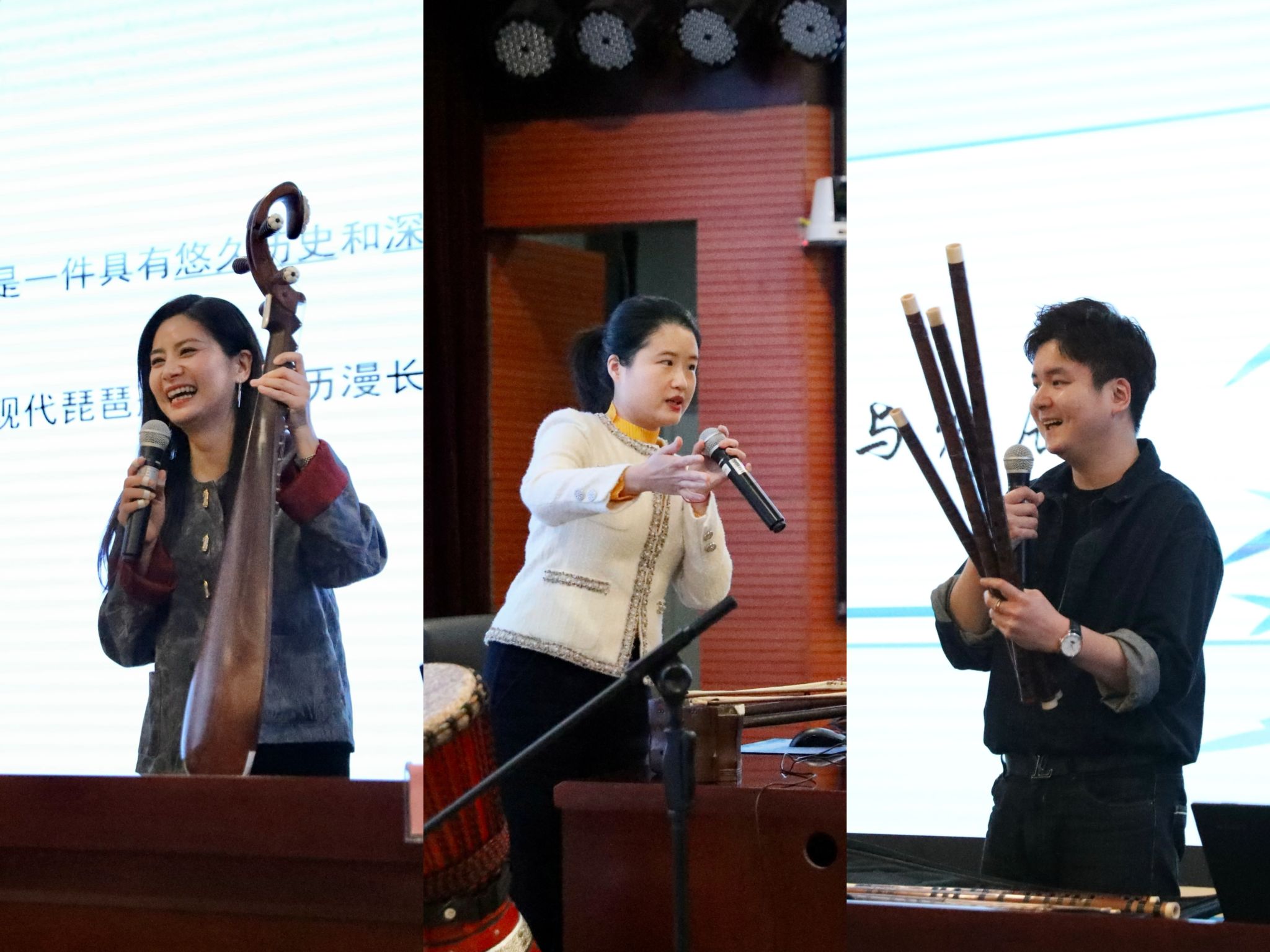 器乐系主任董凌凡、二胡教师杨欣、竹笛教师周昕、西班牙打击乐演奏家雨果共同开展《走进民族器乐》讲演活动。四位老师通过“乐器介绍+乐曲展示”的形式,带领学员们领略了中国传统乐器的独特韵味。