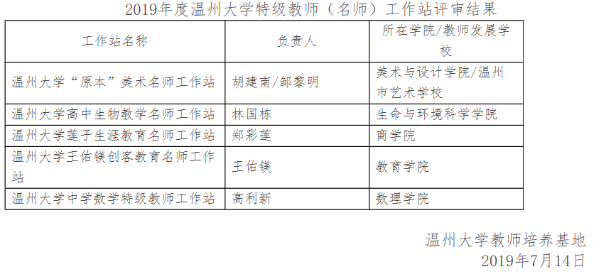 根据《皇冠 特级教师(名师)工作站管理办法(试行)》(温大行政〔2018〕74号)文件的相关规定,经校内专家评审,同意“皇冠 ‘原本’美术名师工作站”等五个工作站立项为2019年度皇冠 特级教师(名师)工作站建站。现将评审结果予以公示,公示时间为五天(7月14日-7月18日)。如有异议,请与皇冠 教师培养基地朱伟老师联系,联系电话:665134。