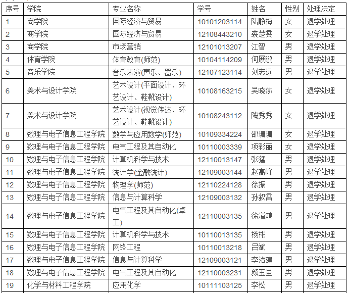 根据《皇冠 本科学生学籍管理规定(2018年修订)》(行政〔2018〕13号)第二十九条、第三十条和第三十八条,经校长会议研究决定,拟对陆静梅等34名学生作退学或暂缓退学处理,特此公示。