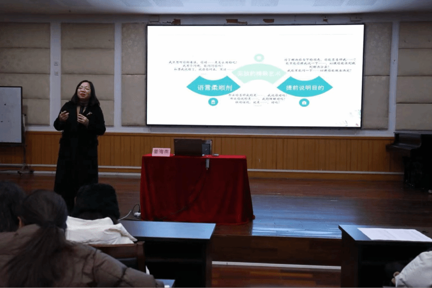 学工部部长姜海燕老师于2024年12月18日在音乐楼201报告厅为2024级新生开及各年级心理委员开展名为《乐韵盈心,幸福启航》的幸福公开课。